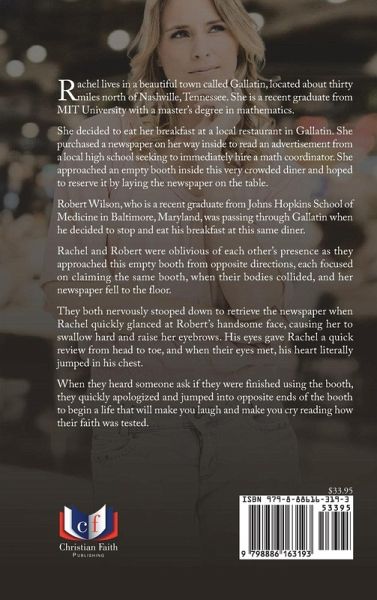 Rachel lives in a beautiful town called Gallatin, located about thirty miles north of Nashville, Tennessee. She is a recent graduate from MIT University with a master's degree in mathematics. She decided to eat her breakfast at a local restaurant in Gallatin. She purchased a newspaper on her way inside to read an advertisement from a local high school seeking to immediately hire a math coordinator. She approached an empty booth inside this very crowded diner and hoped to reserve it by laying the newspaper on the table. Robert Wilson, who is a recent graduate from Johns Hopkins School of Medicine in Baltimore, Maryland, was passing through Gallatin when he decided to stop and eat his breakfast at this same diner. Rachel and Robert were oblivious of each other's presence as they approached this empty booth from opposite directions, each focused on claiming the same booth, when their bodies collided, and her newspaper fell to the floor. They both nervously stooped down to retrieve the newspaper when Rachel quickly glanced at Robert's handsome face, causing her to swallow hard and raise her eyebrows. His eyes gave Rachel a quick review from head to toe, and when their eyes met, his heart literally jumped in his chest. When they heard someone ask if they were finished using the booth, they quickly apologized and jumped into opposite ends of the booth to begin a life that will make you laugh and make you cry reading how their faith was tested.