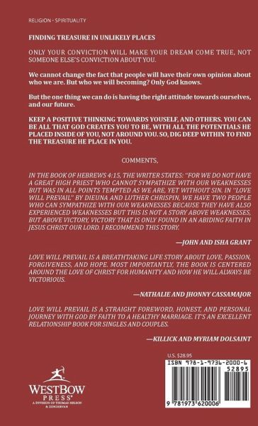 FINDING TREASURE IN UNLIKELY PLACES ONLY YOUR CONVICTION WILL MAKE YOUR DREAM COME TRUE, NOT SOMEONE ELSE'S CONVICTION ABOUT YOU. We cannot change the fact that people will have their own opinion about who we are. But who we will becoming? Only God knows. But the one thing we can do is having the right attitude towards ourselves, and our future. KEEP A POSITIVE THINKING TOWARDS YOUSELF, AND OTHERS. YOU CAN BE ALL THAT GOD CREATES YOU TO BE, WITH ALL THE POTENTIALS HE PLACED INSIDE OF YOU, NOT AROUND YOU. SO, DIG DEEP WITHIN TO FIND THE TREASURE HE PLACE IN YOU. COMMENTS, IN THE BOOK OF HEBREWS 4:15, THE WRITER STATES: ''FOR WE DO NOT HAVE A GREAT HIGH PRIEST WHO ANNOT SYMPHATHIZE WITH OUR WEAKNESSE BUT WAS IN ALL POINTS TEMPTED AS WE ARE, YET WITHOUT SIN. IN ''LOVE WILL PREVAIL'' BY DIEUNA AND LUTHER CHRISPIN, WE HAVE TWO PEOPLE WHO CAN SYMPATHIZE WITH OUR WEAKNESSES BECAUSE THEY HAVE ALSO EXPERIRNCED WEAKNESSES BUT THIS IS NOT A STORY ABOVE WEAKNESSES, BUT ABOVE VICTORY, VICTORY THAT IS ONLY FOUND IN AN ABIDING FAITH IN JESUS CHRIST OUR LORD. I RECOMMEND THIS STORY. -JOHN AND ISHA GRANT LOVE WILL PREVAIL IS A BREATHTAKING LIFE STORY ABOUT LOVE, PASSION, FORGIVENESS, AND HOPE. MOST IMPORTANTLY, THE BOOK IS CENTERD AROUND THE LOVE OF CHRIST FOR HUMANITY AND HOW HE WILL ALWAYS BE VICTORIOUS. -NATHALIE AND JHONNY CASSAMAJOR LOVE WILL PREVAIL IS A STRAIGHT FOREWORD, HONEST, AND PERSONAL JOURNEY WITH GOD BY FAITH TO A HEALTY MARRIAGE. IT'S AN EXCELLENT RELATIONSHIP BOOK FOR SINGLES AND COUPLES. -KILLICK AND MYRIAM DOLSAINT
