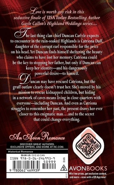 Love is worth any risk in this seductive finale of USA Today Bestselling Author Gayle Callen's Highland Weddings series... The last thing clan chief Duncan Carlyle expects to encounter in the rain-soaked Highlands is Catriona Duff, daughter of the corrupt earl responsible for the price on his head. Yet Duncan finds himself sheltering the beauty who claims to have lost her memory. Catriona could be the key to stopping her father, but only if Duncan can keep her identity?and his dangerously powerful desire?to himself. Duncan may have rescued Catriona, but the gruff outlaw clearly doesn't trust her. She's moved by his mission to rescue kidnapped children, but hiding in a network of caves means living in close quarters with everyone?including Duncan. And even as Catriona struggles to remember her past, the present draws her ever closer to this enigmatic man . . . and to the secret that could change everything.
