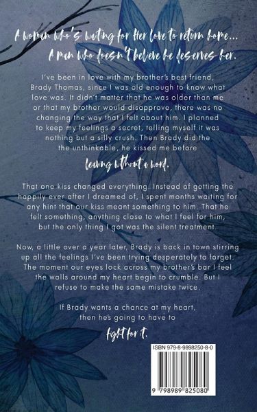 A woman who's waiting for her love to return home... A man who doesn't believe he deserves her. I've been in love with my brother's best friend, Brady Thomas, since I was old enough to know what love was. It didn't matter that he was older than me or that my brother would disapprove, there was no changing the way that I felt about him. I planned to keep my feelings a secret, telling myself it was nothing but a silly crush. Then Brady did the unthinkable, he kissed me before leaving without a word. That one kiss changed everything. Instead of getting the happily ever after I dreamed of, I spent months waiting for any hint that our kiss meant something to him. That he felt something, anything close to what I feel for him, but the only thing I got was the silent treatment. Now, a little over a year later, Brady is back in town stirring up all the feelings I've been trying desperately to forget. The moment our eyes lock across my brother's bar I feel the walls around my heart begin to crumble. But I refuse to make the same mistake twice. If Brady wants a chance at my heart, then he's going to have to fight for it.