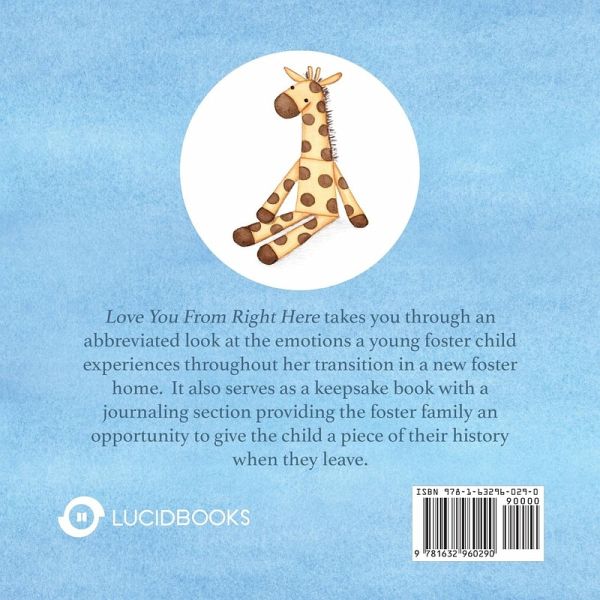 "At CASA, our role is to provide a voice for kids in the foster care system. A book like this is a great tool for our volunteers and for all adults in a foster kid’s life—we highly recommend it!" —Ann McAlpin, Executive Director, CASA Child Advocates of Montgomery County, Texas "This sweet little book is the very one I wish I had when children came and especially when they left. It provides a concrete way to hold an important piece of our shared history. Every person caring for our vulnerable children will want multiple copies." —Kathy Harrison, Author of Another Place at the Table and One Small Boat "I have a new favorite ‘good-bye’ tradition with my foster children. The final pages of the book have room for photos and memories and messages. I plan on re-stocking my supply of this book, as I fully intend on sending this along with every child who leaves my home." —Jamie Finn, Foster Parent, Speaker, Author of "Foster the Family" blog Love You From Right Here is a children’s book for children in foster care. Written from the foster parent to the foster child, it takes you through an abbreviated look at the emotions a young foster child experiences throughout their transition to a new home. The message to the child is that while they are in that home, they will be safe and loved. It also serves as a keepsake book with a journaling section. This portion of the book includes places for photos, journaling lines, and simple writing prompts. Children in foster care move an average of seven times in their lives. The keepsake section of this book gives the foster family an opportunity to provide the child with a piece of their history if they leave.