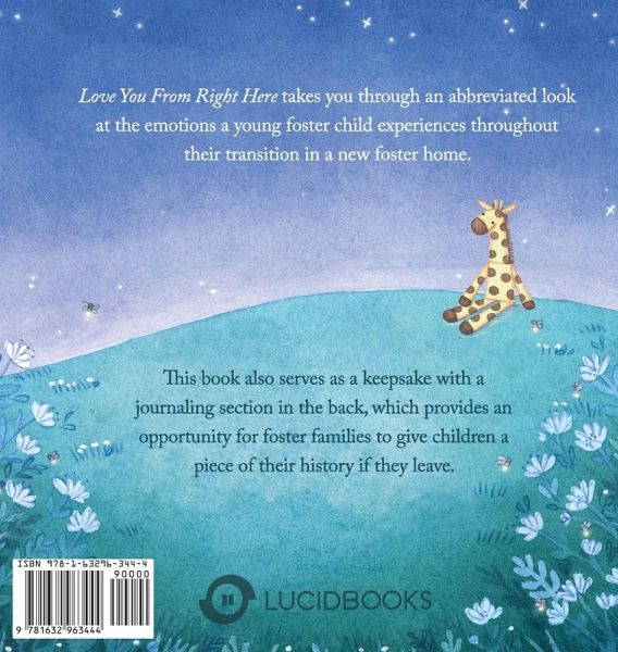 Love You From Right Here takes you through an abbreviated look at the emotions a young foster child experiences throughout their transition in a new foster home. This book also serves as a keepsake with a journaling section in the back, which provides an opportunity for foster families to give children a piece of their history if they leave.