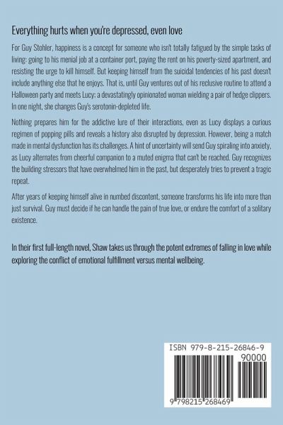 Depression hurts, but does love hurt more? For Guy Stohler, happiness is a concept for someone who isn't totally fatigued by the simple tasks of living: going to his menial job at a container port, paying the rent on his poverty-sized apartment, and resisting the urge to kill himself. But keeping himself from the suicidal tendencies of his past doesn't include anything else that brings him joy. That is, until Guy ventures out of his reclusive routine to attend a Halloween party and meets Lucy; a devastatingly opinionated woman wielding a pair of hedge clippers. In one night, she changes Guy's serotonin-depleted life. Nothing prepares him for the addictive lure of their interactions, even as Lucy displays a curious regimen of popping pills and reveals a history also disrupted by depression. Guy feels a connection far beyond simple desire; however, being a match made in mental dysfunction has its challenges. A hint of uncertainty will send Guy spiraling into anxiety, as Lucy alternates from cheerful companion to a muted enigma that can't be reached. Their pairing is further strained by the demands of Lucy's job working for an artist who insists on her constant presence. Guy recognizes the building stressors that have overwhelmed him in the past, but desperately tries to prevent a tragic repeat. After years of keeping himself alive in numbed discontent, someone transforms his life into more than just survival. Someone beautifully volatile and struggling to preserve her own mental health, terrified she will only hurt those closest to her. Guy must decide if he can handle the pain of true love, or endure the comfort of a solitary existence.