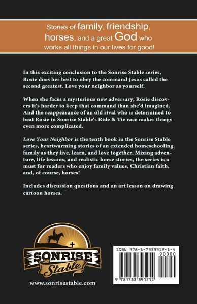 In this exciting conclusion to the Sonrise Stable series, Rosie does her best to obey the command Jesus called the second greatest. Love your neighbor as yourself. When she faces a mysterious new adversary, Rosie discovers it's harder to keep that command than she'd imagined. And the reappearance of an old rival who is determined to beat Rosie in Sonrise Stable's Ride & Tie race makes things even more complicated. Love Your Neighbor is the tenth book in the Sonrise Stable series, heartwarming stories of an extended homeschooling family as they live, learn, and love together. Mixing adventure, life lessons, and realistic horse stories, the series is a must for readers who enjoy family values, Christian faith, and, of course, horses! Includes discussion questions and an art lesson on drawing cartoon horses.