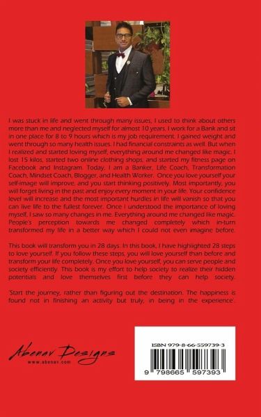 If you love yourself everything around you will change like magic and it is the answer for so many questions within you. This book has 28 steps to love yourself and if you follow it you will fall in love with yourself in 28 days and you will see a transformation within you like magic. If you follow these steps you will love yourself than before and transform your life completely. Once you love yourself you can serve people and society efficiently. This book is my effort to help society to realize their hidden potentials and love themselves first before they help society. 'Start the journey, rather than figuring out the destination. The happiness is found not in finishing an activity but truly, in being in the experience'. What problems you can solve: ¿Self-Image Problems ¿Negative Thinking ¿Confidence Problems ¿Living in the past. ¿People who are stuck in life.