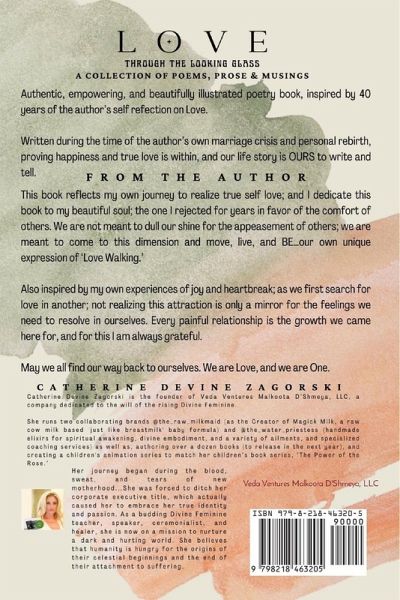 Love: Through the Looking Glass: Inspirational, empowering, and beautifully illustrated poetry book, inspired by 40 years of the author's self refection on Love. Written during the time of the author's own marriage crisis and personal rebirth, proving happiness and true love is within, and our life story is OURS to write and tell. From Author: This book reflects my own journey to realize true self love; and I dedicate this book to my beautiful soul; the one I rejected for years in favor of the comfort of others. We are not meant to dull our shine for the appeasement of others; we are meant to come to this dimension and move, live, and BE...our own unique expression of 'Love Walking.' Also inspired by my own experiences of joy and heartbreak; as we first search for love in another; not realizing this attraction is only a mirror for the feelings we need to resolve in ourselves. Every painful relationship is the growth we came here for, and for this I am always grateful. May we all find our way back to ourselves. We are Love, and we are One. About Author: Catherine Devine Zagorski is the founder of Veda Ventures Malkoota D'Shmeya, LLC, a company dedicated to the will of the rising Divine Feminine. She runs two collaborating brands @the_raw_milkmaid (as the Creator of Magick Milk, a raw cow milk based 'just like breastmilk' baby formula) and @the_water_priestess (handmade elixirs for spiritual awakening, divine embodiment, and a variety of ailments, and specialized coaching services) as well as, authoring over a dozen books (to release in the next year), and creating a children's animation series to match her children's book series, 'The Power of the Rose.' Her journey began during the blood, sweat, and tears of new motherhood...She was forced to ditch her corporate executive title, which actually caused her to embrace her true identity and passion. As a budding Divine Feminine teacher, speaker, ceremonialist, and healer, she is now on a mission to nurture a dark and hurting world. She believes that humanity is hungry for the origins of their celestial beginnings and the end of their attachment to suffering.