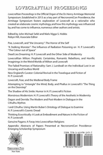 Lovecraftian Proceedings is the Official Organ of the Dr. Henry Armitage Memorial Symposium. Established in 2013 as a key part of NecronomiCon Providence, the Armitage Symposium fosters exploration of Lovecraft as a rationalist who created an elaborate cosmic mythology, and how this mythology was influenced by, and has come to influence, numerous other authors and artists. Table of Contents Preface JOHN MICHAEL SEFEL Introduction NIELS-VIGGO S. HOBBS Poe, Lovecraft, and "the Uncanny": The Horror of the Self ANTHONY CONRAD CHIEFFALO "A Stalking Monster": The Influence of Radiation Poisoning on H. P. Lovecraft's "The Colour out of Space" ANDY TROY Dead Lies Dreaming: H. P. Lovecraft and the Other Side of Modernity ANDREW LENOIR Lovecraftian Milton: Prophetic Certainties, Romantic Rebellions, and Horrific Imaginings in the Weird Worlds of Milton and Lovecraft MARCELLO C. RICCIARDI The Failed Promises of Rationality: Sam J. Lundwall on the Individual Lost in an Uncaring and Soulless World LARS G. E. BACKSTROM New England's Curator: Colonial Revival in the Travelogue and Fiction of H. P. Lovecraft KENNETH W. LAI Lovecraft, Fear, and the Medieval Body Frame PERRY NEIL HARRISON Attempting to "Untangle" the Mind, Body, and Phallus in Lovecraft's "The Thing on the Doorstep" ZACK REARIC The Shadow of His Smile: Humor in H. P. Lovecraft's Fiction STEPHEN WALKER Monstrous Modernism: H. P. Lovecraft's Theory of the Aesthetic in Modernity JASON RAY CARNEY Dagon and Derrida: The Modern and Post-Modern in Dialogue in the Cthulhu Mythos LYLE ENRIGH I and Cthulhu: Using Martin Buber's Ontology of Dialogue to Examine H. P. Lovecraft's Cosmic Dread DANIEL HOLMES Thinking Ecocritically: A Look at Embodiment and Nature in the Fiction of H. P. Lovecraft CORY WILLARD Genuine Pagans: A Foray into Lovecraftian Religions DENNIS P. QUINN Appendix: Abstracts of Papers Presented at NecronomiCon Providence-Emerging Scholarship Symposium CHAIR: JOHN MICHAEL SEFEL Index