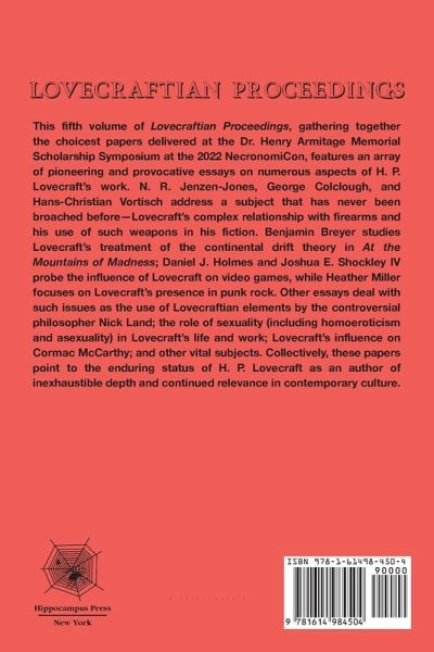 This fifth volume of Lovecraftian Proceedings, gathering together the choicest papers delivered at the Dr. Henry Armitage Memorial Scholarship Symposium at the 2022 NecronomiCon, features an array of pioneering and provocative essays on numerous aspects of H. P. Lovecraft's work. N. R. Jenzen-Jones, George Colclough, and Hans-Christian Vortisch address a subject that has never been broached before-Lovecraft's complex relationship with firearms and his use of such weapons in his fiction. Benjamin Breyer studies Lovecraft's treatment of the continental drift theory in At the Mountains of Madness; Daniel J. Holmes and Joshua E. Shockley IV probe the influence of Lovecraft on video games, while Heather Miller focuses on Lovecraft's presence in punk rock. Other essays deal with such issues as the use of Lovecraftian elements by the controversial philosopher Nick Land; the role of sexuality (including homoeroticism and asexuality) in Lovecraft's life and work; Lovecraft's influence on Cormac McCarthy; and other vital subjects. Collectively, these papers point to the enduring status of H. P. Lovecraft as an author of inexhaustible depth and continued relevance in contemporary culture.