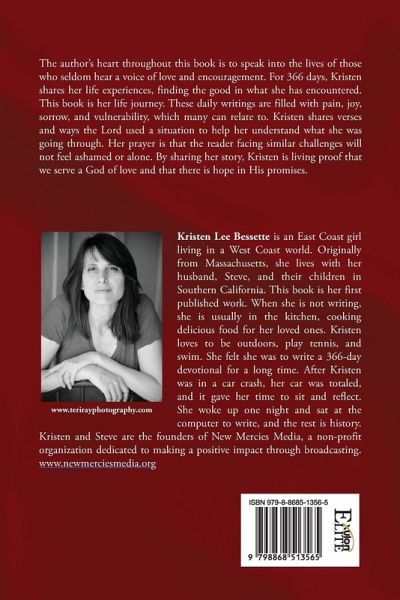 The author's heart throughout this book is to speak into the lives of those who seldom hear a voice of love and encouragement. For 366 days, Kristen shares her life experiences, finding the good in what she has encountered. This book is her life journey. These daily writings are filled with pain, joy, sorrow, and vulnerability, which many can relate to. Kristen shares verses and ways the Lord used a situation to help her understand what she was going through. Her prayer is that the reader facing similar challenges will not feel ashamed or alone. By sharing her story, Kristen is living proof that we serve a God of love and that there is hope in His promises. Kristen Lee Bessette is an East Coast girl living in a West Coast world. Originally from Massachusetts, she lives with her husband, Steve, and their children in Southern California. This book is her first published work. When she is not writing, she is usually in the kitchen, cooking delicious food for her loved ones. Kristen loves to be outdoors, play tennis, and swim. She felt she was to write a 366-day devotional for a long time. After Kristen was in a car crash, her car was totaled, and it gave her time to sit and reflect. She woke up one night and sat at the computer to write, and the rest is history. Kristen and Steve are the founders of New Mercies Media, a non-profit organization dedicated to making a positive impact through broadcasting.www.newmerciesmedia.org