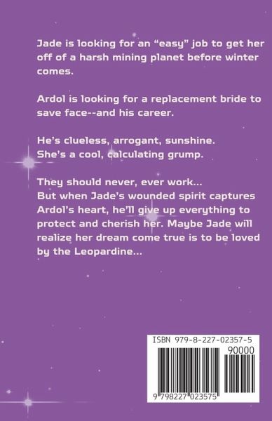 Fall in love with the alien from the galaxy next door... Ardol is one lucky Leopardine. While the majority of males in the Felix Orbus Galaxy are looking at a lifetime of loneliness in the aftermath of the epidemic that decimated the female members of their species, Ardol isn't worried. He knows love is guaranteed for him! His betrothed, the daughter of a wealthy Leopardine diplomat stationed in the Avian Alliance, is safe and healthy. As the galaxy opens up after years of quarantine, Ardol knows that he'll soon claim his mate. His future is secure-until a communication arrives letting him know his luck has run out. His destined Queen is marrying another. Suddenly, arrogant Ardol is scrambling, worried that if he doesn't take the first available mate he meets, he'll never have a partner or a family, and he'll be the laughingstock of the Leopardine System. He'll do anything to save his spots-even if it means considering a human bride! Jade, the unlucky. Jade, the unclaimed. Jade knows that her cold demeanor and aversion to romance are why she's the only single human on Lynx-Nineteen. Unable to stomach the thought of returning to Sapien-Three but completely unsuited to the rugged life on a mining and farming planet where the only thing tougher than the work is the winter season, Jade has a plan. Get off this planet and onboard a comfy ship before the methane blizzards start! She'll do anything to get a fresh start away from this backwater planet-even if it means becoming some Felid freak's mail-order bride. Take two people with very different definitions of love and add in one reluctant marriage of convenience. The result? An unlikely but passionate romance that changes them both. But can this mismatched couple really let go of their old ways to make a new life together? Enjoy another steamy standalone in the Felix Orbus Series!