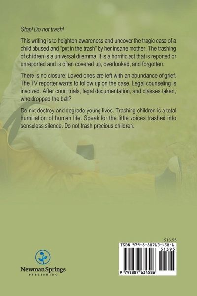 Stop! Do not trash! This writing is to heighten awareness and uncover the tragic case of a child abused and "put in the trash" by her insane mother. The trashing of children is a universal dilemma. It is a horrific act that is reported or unreported and is often covered up, overlooked, and forgotten. There is no closure! Loved ones are left with an abundance of grief. The TV reporter wants to follow up on the case. Legal counseling is involved. After court trials, legal documentation, and classes taken, who dropped the ball? Do not destroy and degrade young lives. Trashing children is a total humiliation of human life. Speak for the little voices trashed into senseless silence. Do not trash precious children.