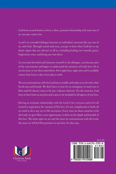 God loves us and desires to have a close, personal relationship with each one of us, not just a select few. Loved is an extended dialogue between an individual, someone like any one of us, and God. Through emails and texts, you get to hear what God has to say about topics that are relevant to all us, including healing our wounds, grace, forgiveness, trust, and being our true selves. As you read this book and immerse yourself in the dialogue, you become part of the conversation and begin to understand the enormity of God's love. He is not far away or out there somewhere. He is right here, right now, and is available twenty-four hours a day, seven days a week. We can communicate with the Lord just as readily and easily as we do with other loved ones and friends. We don't have to wait for an emergency to reach out to Him and He doesn't want to be just a distant observer. On the contrary, God loves to hear from us anytime and wants to be included in all aspects of our lives. Having an intimate relationship with the Lord is for everyone and we're all invited to experience the vastness of His love. It's not complicated or hard; all we need to do is say yes to His invitation. Every time we share ourselves with the Lord, we give Him a new opportunity to show us the depth and breadth of His love. The more open we are and the more we communicate with the Lord, the more we will feel His presence in our lives. It's that easy.