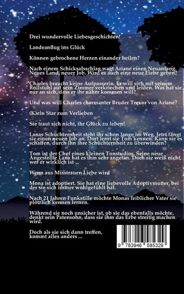 Drei wundervolle Liebesgeschichten!Landeanflug ins GlückKönnen gebrochene Herzen einander heilen?Nach einem Schicksalsschlag wagt Ariane einen Neuanfang. Neues Land, neuer Job. Wird es auch eine neue Liebe geben?Charles braucht keine Aufpasserin. Er will sich mit seinem Rollstuhl auf sein Zimmer verkriechen und leiden. Was hat sie nur an sich, dass er ihr näher kommen will?Und was will Charles charmanter Bruder Trevor von Ariane?(K)ein Star zum VerliebenSie traut sich nicht, ihr Glück zu leben!Lanas Schüchternheit steht ihr schon lange im Weg. Jetzt fängt sie einen neuen Job an. Dort lernt sie Tom kennen. Kann sie es schaffen, durch ihn ihre Schüchternheit zu überwinden?Tom ist der Chef eines kleinen Tonstudios. Seine neue Angestellte Lana hat es ihm sehr angetan. Doch sie weiß nicht, wer er wirklich ist ...Wenn aus Misstrauen Liebe wirdMona ist adoptiert. Sie hat eine liebevolle Adoptivmutter, bei der sie sich immer wohlgefühlt hat.Nach 21 Jahren Funkstille möchte Monas leiblicher Vater sie plötzlich kennen lernen.Während sie noch unsicher ist, ob sie das ebenfalls möchte, denkt sein Patensohn, dass sie ihm das Erbe streitig machen wird.Doch als sie sich dann treffen, kommt alles anders ...