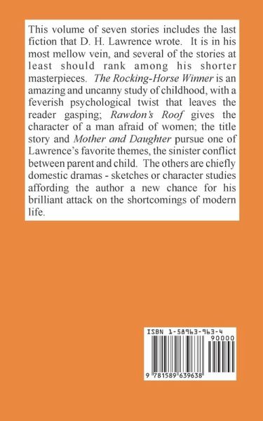 This volume of seven stories includes the last fiction that D. H. Lawrence wrote. It is in his most mellow vein, and several of the stories at least should rank among his shorter masterpieces. The Rocking-Horse Winner is an amazing and uncanny study of childhood, with a feverish psychological twist that leaves the reader gasping; Rawdon's Roof gives the character of a man afraid of women; the title story and Mother and Daughter pursue one of Lawrence's favorite themes, the sinister conflict between parent and child. The others are chiefly domestic dramas - sketches or character studies affording the author a new chance for his brilliant attack on the shortcomings of modern life.