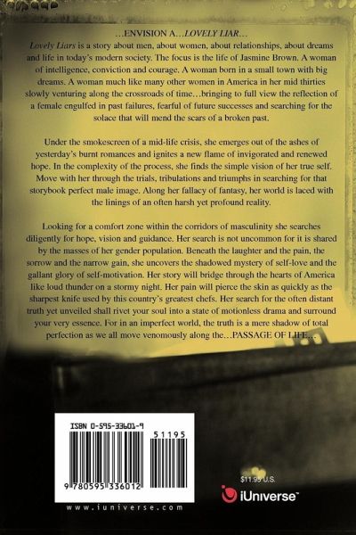 ...ENVISION A....LOVELY LIAR.... Lovely Liars is a story about men, about women, about relationships, about dreams and life in today's modern society. The focus is the life of Jasmine Brown. A woman of intelligence, conviction and courage. A woman born in a small town with big dreams. A woman much like many other women in America in her mid thirties slowly venturing along the crossroads of time...bringing to full view the reflection of a female engulfed in past failures, fearful of future successes and searching for the solace that will mend the scars of a broken past. Under the smokescreen of a mid-life crisis, she emerges out of the ashes of yesterday's burnt romances and ignites a new flame of invigorated and renewed hope. In the complexity of the process, she finds the simple vision of her true self. Move with her through the trials, tribulations and triumphs in searching for that storybook perfect male image. Along her fallacy of fantasy, her world is laced with the linings of an often harsh yet profound reality. Looking for a comfort zone within the corridors of masculinity she searches diligently for hope, vision and guidance. Her search is not uncommon for it is shared by the masses of her gender population. Beneath the laughter and the pain, the sorrow and the narrow gain, she uncovers the shadowed mystery of self-love and the galant glory of self-motivation. Her story will bridge through the hearts of America like loud thunder on a stormy night. Her pain will pierce the skin as quickly as the sharpest knife used by this country's greatest chefs. Her search for the often distant truth yet unveiled shall rivet your soul into a state of motionless drama and surround your very essence. For in an imperfect world, the truth is a mere shadow of total perfection as we all move venomously along the ....PASSAGE OF LIFE.....