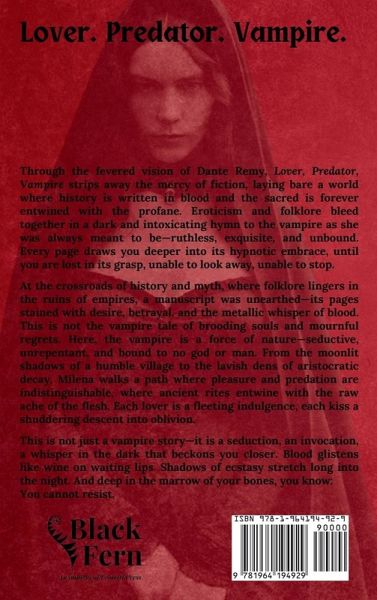 "She rises from the grave, not as a monster, but as a goddess of lust and death." - Eleanor Ashcombe, The London Review of Letters & Arts "Before Carmilla or Dracula, there was Milena-the upír of Eastern Europe, lover and predator alike." - Vojt¿ch Novotný, Pravda Literární "Ecstasy and death entwined-enter the erotic world of Bloodlust." - Anastasia Petrovi¿, Gazeta Belgradska "Buried alive. Reborn in hunger. Seduced by eternity." - Hans Eckhardt, Die Leipziger Morgenblatt A Vampire Unlike Any Other-Milena Awaits At the crossroads of history and myth, where folklore lingers in the ruins of empires, a manuscript was unearthed-its pages stained with desire, betrayal, and the metallic whisper of blood. This is the raw confession of Milena, a being neither damned nor divine, but something far more dangerous. Through the fevered vision of Dante Remy, Lover, Predator, Vampire: Book I, Milena in Bloodlust strips away the mercy of fiction, revealing a world where history is written in blood and the sacred is forever entwined with the profane. Eroticism and folklore bleed together in a dark and intoxicating hymn to the vampire as she was always meant to be-ruthless, exquisite, and unbound. This is not the vampire tale of brooding souls and mournful regrets. Milena's voice is not merely that of a vampire, but of a being caught in the timeless struggle to reconcile yearning with meaning, ecstasy with torment, and the fleeting beauty of life with the permanence of her own shadowed existence. Her journey, filled with forbidden passion and aching self-discovery, unfolds against a world in flux, making her story as universal as it is deeply personal. Here, the vampire is a force of nature-seductive, unrepentant, and bound to no god or man. From the moonlit shadows of a humble village to the lavish dens of aristocratic decay, Milena walks a path where pleasure and predation are indistinguishable, where ancient rites entwine with the raw ache of the flesh. Each lover is a fleeting indulgence, each kiss a shuddering descent into oblivion. Every page draws you deeper into her hypnotic embrace, until you are lost in its grasp, unable to look away, unable to stop. Blood glistens like wine on waiting lips. Shadows of ecstasy stretch long into the night. And deep in the marrow of your bones, you know: You cannot resist.
