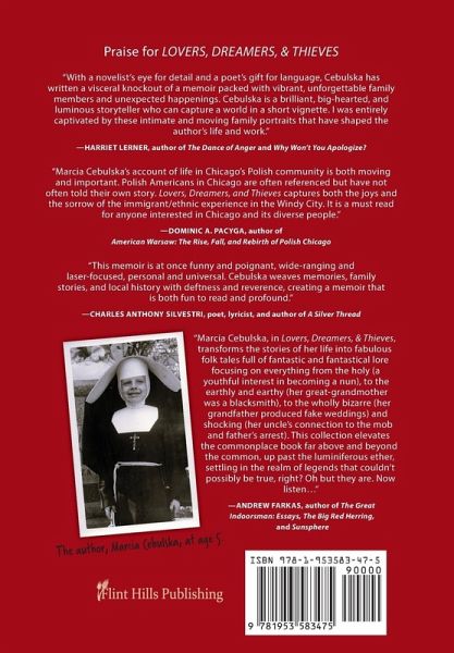 "With a novelist's eye for detail and a poet's gift for language, Cebulska has written a visceral knockout of a memoir packed with vibrant, unforgettable family members and unexpected happenings. Cebulska is a brilliant, big-hearted, and luminous storyteller who can capture a world in a short vignette. I was entirely captivated by these intimate and moving family portraits that have shaped the author's life and work." Harriet Lerner, author of The Dance of Anger and Why Won't You Apologize? "This memoir is at once funny and poignant, wide-ranging and laser-focused, personal and universal. Cebulska weaves memories, family stories, and local history with deftness and reverence, creating a memoir that is both fun to read and profound." Charles Anthony Silvestri, poet, lyricist, author of A Silver Thread "Marcia Cebulska's account of life in Chicago's Polish community is both moving and important. Polish Americans in Chicago are often referenced but have not often told their own story. Lovers, Dreamers, and Thieves captures both the joys and the sorrow of the immigrant/ethnic experience in the Windy City. It is a must read for anyone interested in Chicago and its diverse people." Dominic A. Pacyga, Author of American Warsaw: The Rise, Fall and Rebirth of Polish Chicago. "Marcia Cebulska, in Lovers, Dreamers, & Thieves, transforms the stories of her life into fabulous folk tales full of fantastic and fantastical lore focusing on everything from the holy (a youthful interest in becoming a nun), to the earthly and earthy (her great-grandmother was a blacksmith), to the wholly bizarre (her grandfather produced fake weddings) and shocking (her uncle's connection to the mob and father's arrest). This collection elevates the commonplace book far above and beyond the common, up past the luminiferous ether, settling in the realm of legends that couldn't possibly be true, right? Oh but they are. Now listen..." Andrew Farkas, Author of The Great Indoorsman: Essays, The Big Red Herring, and Sunsphere