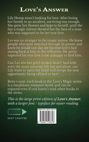 Lily Hemp wasn't looking for love. After losing her family in an accident, surviving was enough. She grew her flowers and kept to herself, until the day a magic mirror showed her the face of a man who was supposed to be her true love. Les was no stranger to the magic mirror. He knew people who were matched through its power, and knew he would one day see his true love's face staring back at him in the reflection. He never expected his true love to be unhappy to find him. Can Les win her grief-broken heart? And with even the most innocent left lost and alone, can Lily learn to open her heart and accept the new opportunity being offered to her? This is the large print edition of Love's Answer, with a larger font / typeface for easier reading