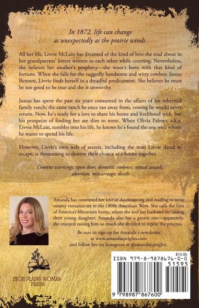 In 1872, life can change as unexpectedly as the prairie winds. All her life, Livvie McLain has dreamed of the kind of love she read about in her grandparents' letters written to each other while courting. Nevertheless, she believes her mother's prophecy-she wasn't born with that kind of fortune. When she falls for the ruggedly handsome and witty cowboy, Justus Bennett, Livvie finds herself in a dreadful predicament. She believes he must be too good to be true and she is unworthy. Justus has spent the past six years consumed in the affairs of his inherited family ranch; the same ranch he once ran away from, vowing he would never return. Now, he's ready for a love to share his home and livelihood with, but his prospects of finding her are slim to none. When Olivia Palmer, a.k.a. Livvie McLain, tumbles into his life, he knows he's found the one with whom he wants to spend his life. However, Livvie's own web of secrets, including the man Livvie dared to escape, is threatening to destroy their chance at a future together. Content warnings: open door sex scenes, domestic violence, sexual assault, abortion, miscarriage, death