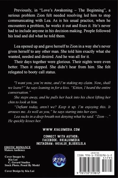 Previously, in "Love's Awakening - The Beginning", a serious problem Zion felt needed resolving led him to stop communicating with Lea. As is his usual practice, when he encounters a problem, he works it out and fixes it. He's never had to include anyone in his decision making. People followed his lead and did what he told them. Lea opened up and gave herself to Zion in a way she's never given herself to any other man. She told him exactly what she wanted, needed and desired. And he was all for it. Their days together were glorious. Their nights were even better. Then it stopped. She didn't hear from him. She felt relegated to booty call status. "I want you, you're mine, and I'm staking my claim. Now, shall we leave?" he says leaning in for a kiss. "Kitten, I heard the entire conversation." She steps away, and he pulls her back into his chest lifting her chin to look at him. "Defiant today, aren't we? Keep it up. I'm enjoying this. It arouses me. As well as you," he says staring into her eyes. Lea sucks in a deep breath not denying what he said. "Zion-." He quickly kisses her.