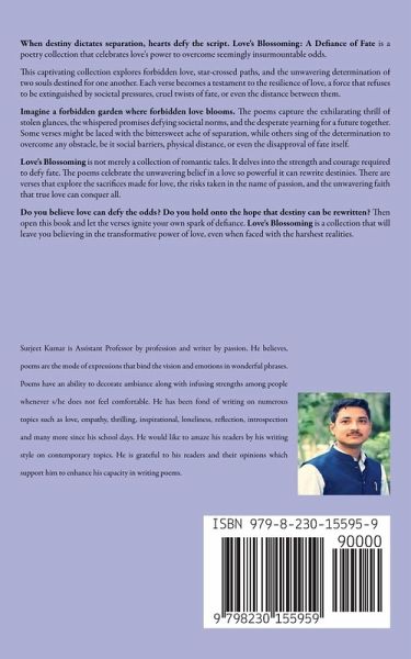 When destiny dictates separation, hearts defy the script. Love's Blossoming: A Defiance of Fate is a poetry collection that celebrates love's power to overcome seemingly insurmountable odds. This captivating collection explores forbidden love, star-crossed paths, and the unwavering determination of two souls destined for one another. Each verse becomes a testament to the resilience of love, a force that refuses to be extinguished by societal pressures, cruel twists of fate, or even the distance between them. Imagine a forbidden garden where forbidden love blooms. The poems capture the exhilarating thrill of stolen glances, the whispered promises defying societal norms, and the desperate yearning for a future together. Some verses might be laced with the bittersweet ache of separation, while others sing of the determination to overcome any obstacle, be it social barriers, physical distance, or even the disapproval of fate itself. Love's Blossoming is not merely a collection of romantic tales. It delves into the strength and courage required to defy fate. The poems celebrate the unwavering belief in a love so powerful it can rewrite destinies. There are verses that explore the sacrifices made for love, the risks taken in the name of passion, and the unwavering faith that true love can conquer all. Do you believe love can defy the odds? Do you hold onto the hope that destiny can be rewritten? Then open this book and let the verses ignite your own spark of defiance. Love's Blossoming is a collection that will leave you believing in the transformative power of love, even when faced with the harshest realities.