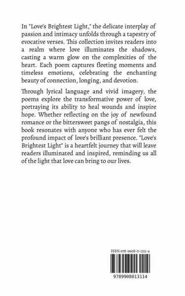 In "Love's Brightest Light," the delicate interplay of passion and intimacy unfolds through a tapestry of evocative verses. This collection invites readers into a realm where love illuminates the shadows, casting a warm glow on the complexities of the heart. Each poem captures fleeting moments and timeless emotions, celebrating the enchanting beauty of connection, longing, and devotion. Through lyrical language and vivid imagery, the poems explore the transformative power of love, portraying its ability to heal wounds and inspire hope. Whether reflecting on the joy of newfound romance or the bittersweet pangs of nostalgia, this book resonates with anyone who has ever felt the profound impact of love's brilliant presence. "Love's Brightest Light" is a heartfelt journey that will leave readers illuminated and inspired, reminding us all of the light that love can bring to our lives.