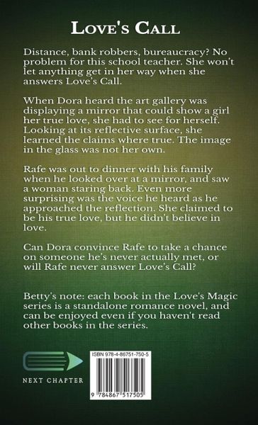Distance, bank robbers, bureaucracy? No problem for this school teacher. She won't let anything get in her way when she answers Love's Call. When Dora heard the art gallery was displaying a mirror that could show a girl her true love, she had to see for herself. Looking at its reflective surface, she learned the claims where true. The image in the glass was not her own. Rafe was out to dinner with his family when he looked over at a mirror, and saw a woman staring back. Even more surprising was the voice he heard as he approached the reflection. She claimed to be his true love, but he didn't believe in love. Can Dora convince Rafe to take a chance on someone he's never actually met, or will Rafe never answer Love's Call?