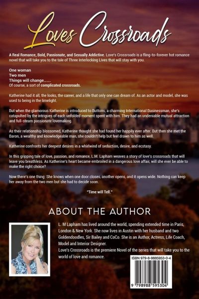 A Real Romance, Bold, Passionate, and Sexually Addictive. Love's Crossroads is a fling-to-forever hot romance novel that will take you to the tale of Three Interlocking Lives that will stay with you. One woman Two men Things will change....... Of course, a sort of complicated crossroads. Katherine had the looks, career, and a life that only one could imagine. She was used to being in the limelight as a successful model and actress. But when the glamorous Katherine is introduced to Buttons, a charming International Businessman, she's catapulted by the intrigues of each unfolded moment spent with him. They had an undeniable mutual attraction and full-steam passionate lovemaking. As their relationship blossomed, Katherine thought she had found her happily ever after. But then she met the Baron, an elegant gentleman of Aristocratic charm, she couldn't help but feel drawn towards him. Katherine confronts her deepest desires in a whirlwind of seduction, desire, and ecstasy. In this gripping tale of love, passion, and romance, L.M. Lapham weaves a story of love's crossroads that will leave you breathless. As Katherine's heart became embroiled in a beautiful love affair, will she ever be able to make the right choice? Now there's one thing: She knows when one door closes, another opens, and it opens wide. Nothing can keep her away from the two men but she had to decide soon. "Time will Tell."
