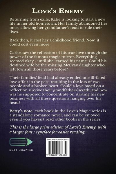 Returning from exile, Katie is looking to start a new life in her old hometown. Her family abandoned her once, allowing her grandfather's feud to rule their lives. Back then, it cost her a childhood friend. Now, it could cost even more. Carlos saw the reflection of his true love through the power of the famous magic mirror. Everything seemed okay - until she learned his name. Could his destined wife be the missing McCray daughter who left town all those years before? Their families' feud had already ended one ill-fated love affair in the past, resulting in the loss of two people and a broken heart. Could a love based on a reflection survive their grandfathers' wrath, and how was he supposed to concentrate on starting his new business with all these questions hanging over his head? This is the large print edition of Love's Enemy, with a larger font / typeface for easier reading