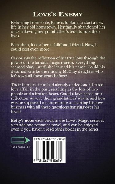 Returning from exile, Katie is looking to start a new life in her old hometown. Her family abandoned her once, allowing her grandfather's feud to rule their lives. Back then, it cost her a childhood friend. Now, it could cost even more. Carlos saw the reflection of his true love through the power of the famous magic mirror. Everything seemed okay - until she learned his name. Could his destined wife be the missing McCray daughter who left town all those years before? Their families' feud had already ended one ill-fated love affair in the past, resulting in the loss of two people and a broken heart. Could a love based on a reflection survive their grandfathers' wrath, and how was he supposed to concentrate on starting his new business with all these questions hanging over his head?