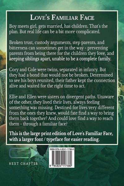 Boy meets girl, gets married, has children. That's the plan. But real life can be a bit more complicated. Broken trust, custody arguments, step parents, and bitterness can sometimes get in the way - preventing parents from being there for the children they love, and keeping siblings apart, unable to be a complete family. Cory and Cole were twins, separated in infancy. But they had a bond that would not be broken. Determined to see his boys reunited, their father kept the connection alive and waited for the right time to act. Ellie and Ellen were sisters on divergent paths. Unaware of the other, they lived their lives, always feeling something was missing. Destined for lives very different from the ones they knew, would fate find a way to bring them back together? And could love find a way to reach them - through a familiar face? This is the large print edition of Love's Familiar Face, with a larger font / typeface for easier reading.