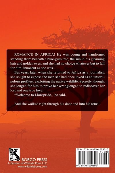 ROMANCE IN AFRICA! He was young and handsome, standing there beneath a blue-gum tree, the sun in his gleaming hair and golden eyes, and she had no choice whatever but to fall for him, innocent as she was. But years later when she returned to Africa as a journalist, she sought to expose the man she had once loved as an unscrupulous profiteer exploiting the native wildlife. Secretly, though, she longed for him to prove her wrong...longed to rediscover her lost and one true love. "Welcome to Lionspride," he said. And she walked right through his door and into his arms!