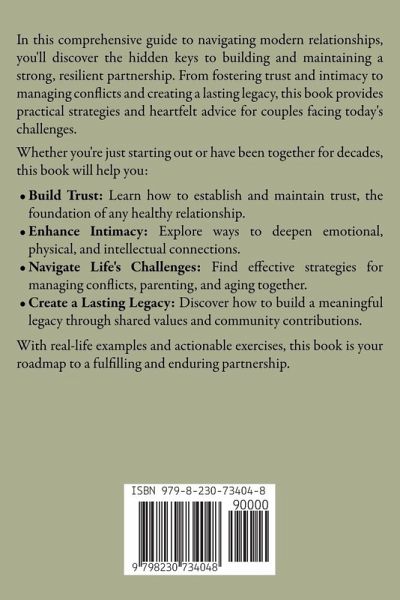 In this comprehensive guide to navigating modern relationships, you'll discover the hidden keys to building and maintaining a strong, resilient partnership. From fostering trust and intimacy to managing conflicts and creating a lasting legacy, this book provides practical strategies and heartfelt advice for couples facing today's challenges. Whether you're just starting out or have been together for decades, this book will help you:Build Trust: Learn how to establish and maintain trust, the foundation of any healthy relationship. Enhance Intimacy: Explore ways to deepen emotional, physical, and intellectual connections. Navigate Life's Challenges: Find effective strategies for managing conflicts, parenting, and aging together. Create a Lasting Legacy: Discover how to build a meaningful legacy through shared values and community contributions. With real-life examples and actionable exercises, this book is your roadmap to a fulfilling and enduring partnership.