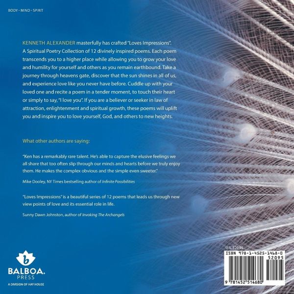 Kenneth Alexander masterfully has crafted "Loves Impressions". A Spiritual Poetry Collection of 12 divinely inspired poems. Each poem transcends you to a higher place while allowing you to grow your love and humility for yourself and others as you remain earthbound. Take a journey through heavens gate, discover that the sun shines in all of us, and experience love like you never have before. Cuddle up with your loved one and recite a poem in a tender moment, to touch their heart or simply to say, "I love you". If you are a believer or seeker in law of attraction, enlightenment and spiritual growth, these poems will uplift you and inspire you to love yourself, God, and others to new heights. What other authors are saying: "Ken has a remarkably rare talent. He's able to capture the elusive feelings we all share that too often slip through our minds and hearts before we truly enjoy them. He makes the complex obvious and the simple even sweeter." Mike Dooley, NY Times bestselling author of Infinite Possibilities "Loves Impressions" is a beautiful series of 12 poems that leads us through new view points of love and its essential role in life. Sunny Dawn Johnston, author of Invoking The Archangels