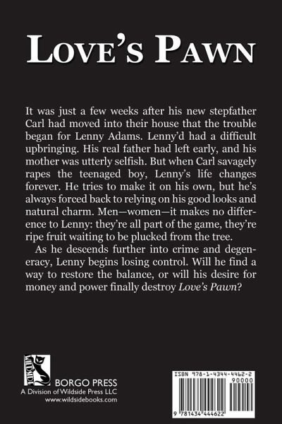 It was just a few weeks after his new stepfather Carl had moved into their house that the trouble began for Lenny Adams. Lenny'd had a difficult upbringing. His real father had left early, and his mother was utterly selfish. But when Carl savagely rapes the teenaged boy, Lenny's life changes forever. He tries to make it on his own, but he's always forced back to relying on his good looks and natural charm. Men--women--it makes no difference to Lenny: they're all part of the game, they're ripe fruit waiting to be plucked from the tree. As he descends further into crime and degeneracy, Lenny begins losing control. Will he find a way to restore the balance, or will his desire for money and power finally destroy LOVE'S PAWN?