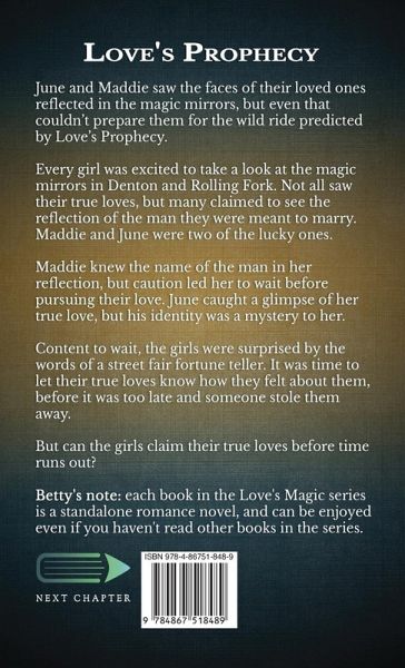 June and Maddie saw the faces of their loved ones reflected in the magic mirrors, but even that couldn't prepare them for the wild ride predicted by Love's Prophecy. Every girl was excited to take a look at the magic mirrors in Denton and Rolling Fork. Not all saw their true loves, but many claimed to see the reflection of the man they were meant to marry. Maddie and June were two of the lucky ones. Maddie knew the name of the man in her reflection, but caution led her to wait before pursuing their love. June caught a glimpse of her true love, but his identity was a mystery to her. Content to wait, the girls were surprised by the words of a street fair fortune teller. It was time to let their true loves know how they felt about them, before it was too late and someone stole them away. But can the girls claim their true loves before time runs out? Betty's note: each book in the Love's Magic series is a standalone romance novel, and can be enjoyed even if you haven't read other books in the series.
