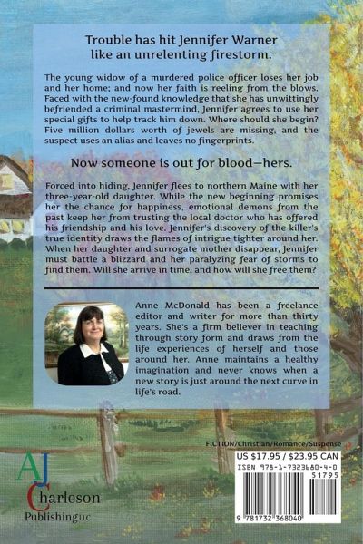Trouble has hit Jennifer Warner like an unrelenting firestorm. The young widow of a murdered police officer loses her job and her home; and now her faith is reeling from the blows. Faced with the new-found knowledge that she has unwittingly befriended a criminal mastermind, Jennifer agrees to use her special gifts to help track him down. Where should she begin? Five million dollars worth of jewels are missing, and the suspect uses an alias and leaves no fingerprints. Now someone is out for blood—hers. Forced into hiding, Jennifer flees to northern Maine with her three-year-old daughter. While the new beginning promises her the chance for happiness, emotional demons from the past keep her from trusting the local doctor who has offered his friendship and his love. Jennifer's discovery of the killer's true identity draws the flames of intrigue tighter around her. When her daughter and surrogate mother disappear, Jennifer must battle a blizzard and her paralyzing fear of storms to find them. Will she arrive in time, and how will she free them?