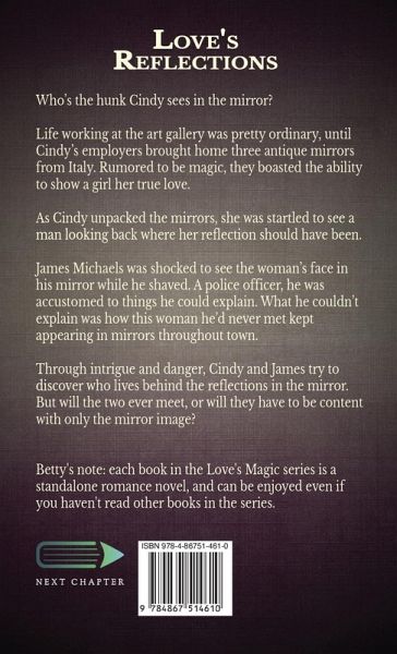 Who's the hunk Cindy sees in the mirror? Life working at the art gallery was pretty ordinary, until Cindy's employers brought home three antique mirrors from Italy. Rumored to be magic, they boasted the ability to show a girl her true love. As Cindy unpacked the mirrors, she was startled to see a man looking back where her reflection should have been. James Michaels was shocked to see the woman's face in his mirror while he shaved. A police officer, he was accustomed to things he could explain. What he couldn't explain was how this woman he'd never met kept appearing in mirrors throughout town. Through intrigue and danger, Cindy and James try to discover who lives behind the reflections in the mirror. But will the two ever meet, or will they have to be content with only the mirror image? Betty's note: each book in the Love's Magic series is a standalone romance novel, and can be enjoyed even if you haven't read other books in the series.