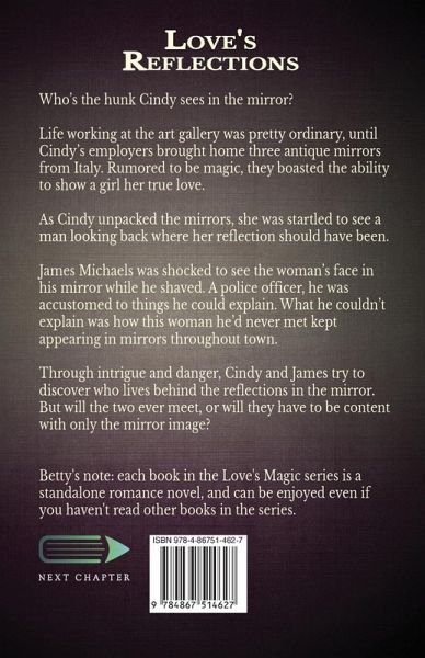 Who's the hunk Cindy sees in the mirror? Life working at the art gallery was pretty ordinary, until Cindy's employers brought home three antique mirrors from Italy. Rumored to be magic, they boasted the ability to show a girl her true love. As Cindy unpacked the mirrors, she was startled to see a man looking back where her reflection should have been. James Michaels was shocked to see the woman's face in his mirror while he shaved. A police officer, he was accustomed to things he could explain. What he couldn't explain was how this woman he'd never met kept appearing in mirrors throughout town. Through intrigue and danger, Cindy and James try to discover who lives behind the reflections in the mirror. But will the two ever meet, or will they have to be content with only the mirror image? Betty's note: each book in the Love's Magic series is a standalone romance novel, and can be enjoyed even if you haven't read other books in the series.