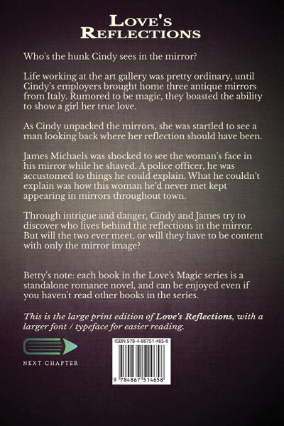 Who's the hunk Cindy sees in the mirror? Life working at the art gallery was pretty ordinary, until Cindy's employers brought home three antique mirrors from Italy. Rumored to be magic, they boasted the ability to show a girl her true love. As Cindy unpacked the mirrors, she was startled to see a man looking back where her reflection should have been. James Michaels was shocked to see the woman's face in his mirror while he shaved. A police officer, he was accustomed to things he could explain. What he couldn't explain was how this woman he'd never met kept appearing in mirrors throughout town. Through intrigue and danger, Cindy and James try to discover who lives behind the reflections in the mirror. But will the two ever meet, or will they have to be content with only the mirror image? Betty's note: each book in the Love's Magic series is a standalone romance novel, and can be enjoyed even if you haven't read other books in the series. This is the large print edition of Love's Reflections, with a larger font / typeface for easier reading.
