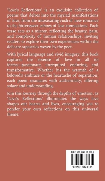 "Love's Reflections" is an exquisite collection of poems that delves into the myriad manifestations of love, from the intoxicating rush of new romance to the bittersweet echoes of lost connections. Each verse acts as a mirror, reflecting the beauty, pain, and complexity of human relationships, inviting readers to explore their own experiences within the delicate tapestries woven by the poet. With lyrical language and vivid imagery, this book captures the essence of love in all its forms-passionate, unrequited, enduring, and transformative. Whether it's the warmth of a beloved's embrace or the heartache of separation, each poem resonates with authenticity, offering solace and understanding. Join this journey through the depths of emotion, as "Love's Reflections" illuminates the ways love shapes our hearts and lives, encouraging you to ponder your own reflections on this universal theme.