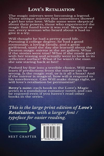 The magic mirrors were becoming a legend. Three antique mirrors that sometimes showed a girl her true love. While some were skeptical about their powers, those who experienced the magic first hand knew it was real. Skeptical or not, every woman who heard about it had to give it a try. Will thought he had a pretty good life. Pursuing a college degree, he had a good roommate, a loving family, and a great girlfriend, until the day she learned about the Denton magic mirror at the art gallery. What if the stories were true? What if she made good with her teasing and actually went to look in its reflective surface? What if he wasn't the man she saw staring back at her? Pushed by fear into a terrible choice, Will must learn if predictions from the mirror can be wrong. Is the magic real, or is it all a hoax? And if the mirror is magical, how will it respond to his interference. Can Will make things right, or will love's retaliation be permanent? Betty's note: each book in the Love's Magic series is a standalone romance novel, and can be enjoyed even if you haven't read other books in the series. This is the large print edition of Love's Retaliation, with a larger font / typeface for easier reading.¿
