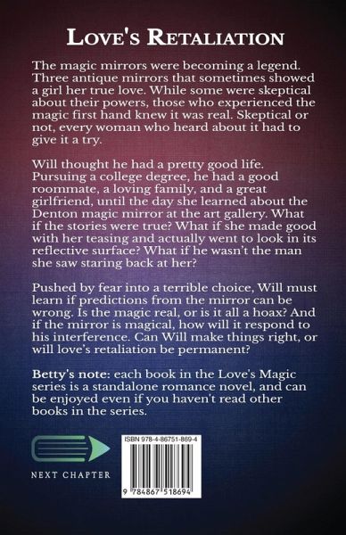 The magic mirrors were becoming a legend. Three antique mirrors that sometimes showed a girl her true love. While some were skeptical about their powers, those who experienced the magic first hand knew it was real. Skeptical or not, every woman who heard about it had to give it a try. Will thought he had a pretty good life. Pursuing a college degree, he had a good roommate, a loving family, and a great girlfriend, until the day she learned about the Denton magic mirror at the art gallery. What if the stories were true? What if she made good with her teasing and actually went to look in its reflective surface? What if he wasn't the man she saw staring back at her? Pushed by fear into a terrible choice, Will must learn if predictions from the mirror can be wrong. Is the magic real, or is it all a hoax? And if the mirror is magical, how will it respond to his interference. Can Will make things right, or will love's retaliation be permanent? Betty's note: each book in the Love's Magic series is a standalone romance novel, and can be enjoyed even if you haven't read other books in the series.
