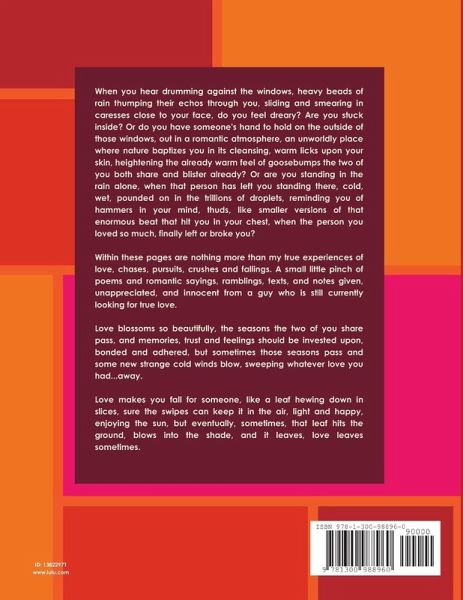 Within these pages are nothing more than my true experiences of love, chases, pursuits, crushes, and fallings. A small little pinch of poems and romantic sayings, ramblings, texts, and notes given, unappreciated, and innocent from a guy who is still currently looking for true love. Love blossoms so beautifully, the seasons the two of you share pass, and memories, trust and feelings should be invested upon, bonded and adhered, but sometimes those seasons pass and some new strange cold winds blow, sweeping whatever love you had...away. Love makes you fall for someone, like a leaf hewing down in slices, sure the swipes can keep it in the air, light and happy, but eventually, sometimes, that leaf hits the ground, and it leaves, love leaves sometimes.