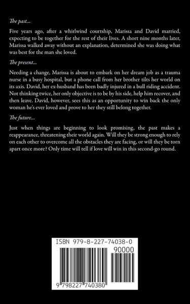 The past... Five years ago, after a whirlwind courtship, Marissa and David married, expecting to be together for the rest of their lives. A short nine months later, Marissa walked away without an explanation, determined she was doing what was best for the man she loved. The present... Needing a change, Marissa is about to embark on her dream job as a trauma nurse in a busy hospital, but a phone call from her brother tilts her world on its axis. David, her ex-husband has been badly injured in a bull riding accident. Not thinking twice, her only objective is to be by his side, help him recover, and then leave. David, however, sees this as an opportunity to win back the only woman he's ever loved and prove to her they still belong together. The future... Just when things are beginning to look promising, the past makes a reappearance, threatening their world again. Will they be strong enough to rely on each other to overcome all the obstacles they are facing, or will they be torn apart once more? Only time will tell if love will win in this second-go round.