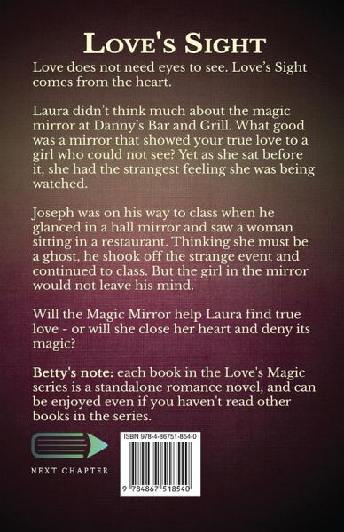 Love does not need eyes to see. Love's Sight comes from the heart. Laura didn't think much about the magic mirror at Danny's Bar and Grill. What good was a mirror that showed your true love to a girl who could not see? Yet as she sat before it, she had the strangest feeling she was being watched. Joseph was on his way to class when he glanced in a hall mirror and saw a woman sitting in a restaurant. Thinking she must be a ghost, he shook off the strange event and continued to class. But the girl in the mirror would not leave his mind. Will the Magic Mirror help Laura find true love - or will she close her heart and deny its magic?