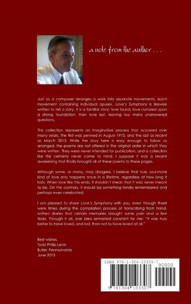 Just as a composer arranges a work into separate movements, each movement containing individual opuses, Love's Symphony is likewise written to tell a story. It is a familiar story: love found, love nurtured upon a strong foundation, then love lost, leaving too many unanswered questions.