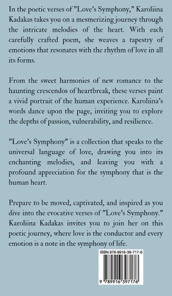 In the poetic verses of "Love's Symphony," Karoliina Kadakas takes you on a mesmerizing journey through the intricate melodies of the heart. With each carefully crafted poem, she weaves a tapestry of emotions that resonates with the rhythm of love in all its forms. From the sweet harmonies of new romance to the haunting crescendos of heartbreak, these verses paint a vivid portrait of the human experience. Karoliina's words dance upon the page, inviting you to explore the depths of passion, vulnerability, and resilience. "Love's Symphony" is a collection that speaks to the universal language of love, drawing you into its enchanting melodies, and leaving you with a profound appreciation for the symphony that is the human heart. Prepare to be moved, captivated, and inspired as you dive into the evocative verses of "Love's Symphony." Karoliina Kadakas invites you to join her on this poetic journey, where love is the conductor and every emotion is a note in the symphony of life. Copyright © 2024 Book Fairy Publishing