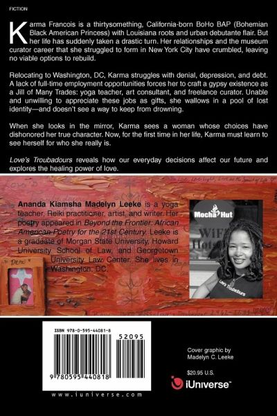 Karma Francois is a thirty-something, California-born BoHo BAP (Bohemian Black American Princess) with Louisiana roots and urban debutante flair. But her life has suddenly taken a drastic turn. Her relationships and the museum curator career that she struggled to form in New York City have crumbled, leaving no viable options to rebuild. Relocating to Washington, DC, Karma struggles with denial, depression, and debt. A lack of full-time employment opportunities forces her to craft a gypsy existence as a Jill of Many Trades: yoga teacher, art consultant, and freelance curator. Unable and unwilling to appreciate these jobs as gifts, she wallows in a pool of lost identity-and doesn't see a way to keep from drowning. When she looks in the mirror, Karma sees a woman whose choices have dishonored her true character. Now, for the first time in her life, Karma must learn to see herself for who she really is. Love's Troubadours reveals how our everyday decisions affect our future and explores the healing power of love.