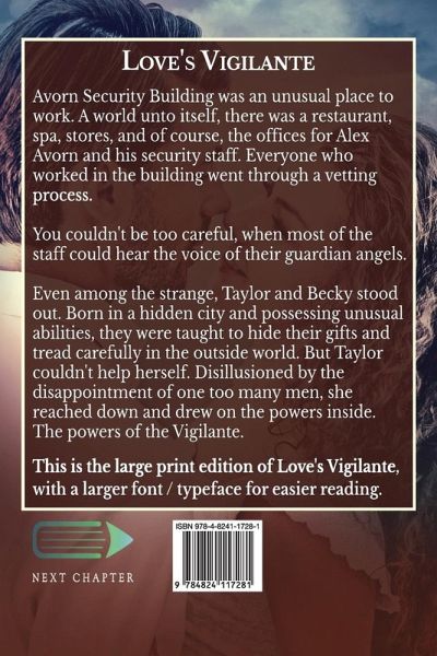 Avorn Security Building was an unusual place to work. A world unto itself, there was a restaurant, spa, stores, and of course, the offices for Alex Avorn and his security staff. Everyone who worked in the building went through a vetting process. You couldn't be too careful, when most of the staff could hear the voice of their guardian angels. Even among the strange, Taylor and Becky stood out. Born in a hidden city and possessing unusual abilities, they were taught to hide their gifts and tread carefully in the outside world. But Taylor couldn't help herself. Disillusioned by the disappointment of one too many men, she reached down and drew on the powers inside. The powers of the Vigilante. This is the large print edition of Love's Vigilante, with a larger font / typeface for easier reading.